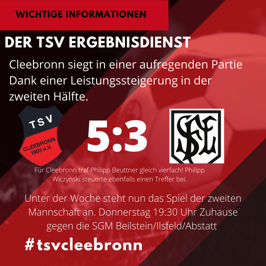 Der TSV Cleebronn holt den zweiten Saisonsieg und den ersten Heimsieg gegen die Zweitvertretung von Spfr Lauffen durch einen 5:3-Erfolg.