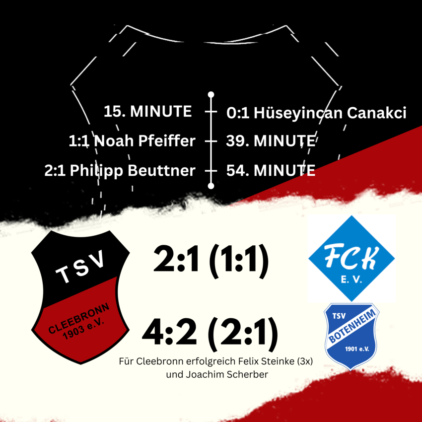 Joachim Scherber brachte die Cleebronner per Foulelfmeter in Front. Dem Treffer ließ Felix Steinke einen Treffer folgen bevor die Botenheimer den Anschlusstreffer erzielten. Davon ließ man sich nicht verunsichern und traf direkt nach der Pause zum 3:1. Mit seinem zweiten und dritten Treffer in der 60. Minute erkor sich Felix Steinke zum Derbyhelden und Spieler des Tages. Ein wenig Ergebniskosmetik betrieb Michael Kühne mit seinem Treffer zum 4:2.
