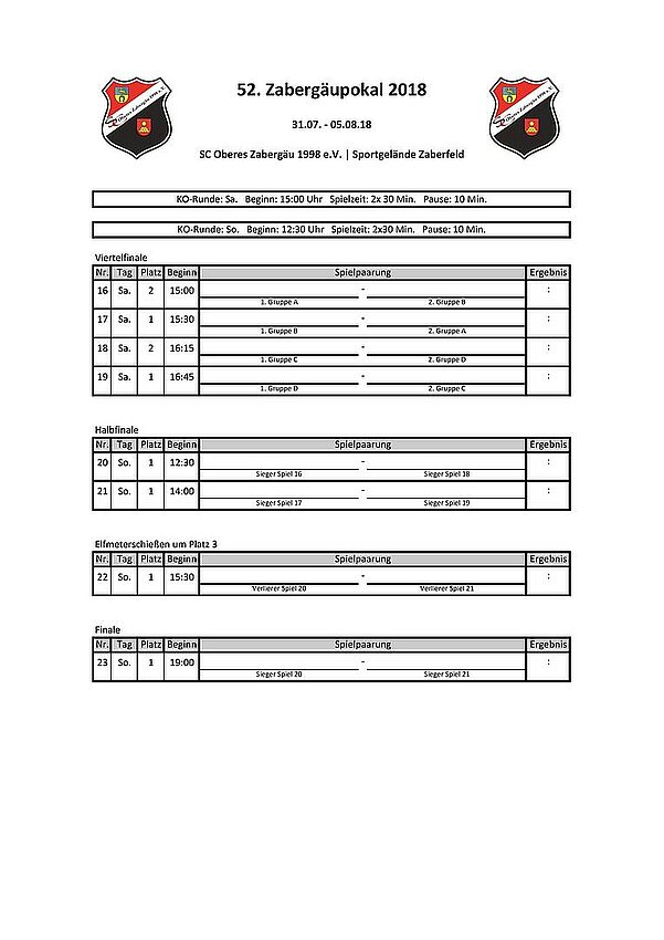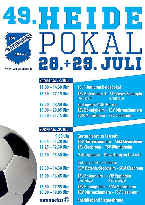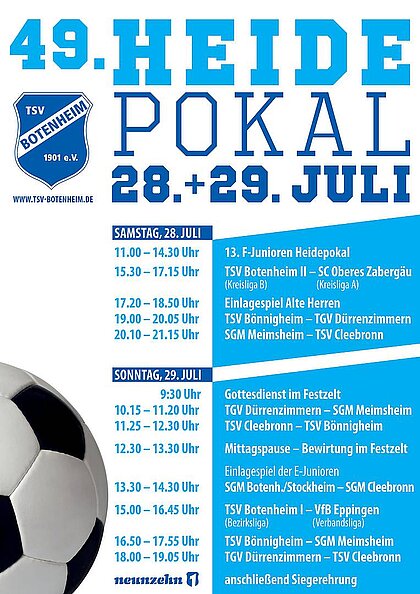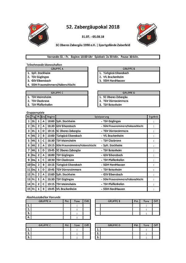 Wie in jedem Jahr bilden der Heidepokal beim TSV Botenheim und der Zabergäupokal, der in diesem Jahr beim SC Oberes Zabergäu in Zaberfeld ausgetragen wird, die Highlights der Vorbereitung. Die genauen Spieltermine dieser Wettbewerbe können den beigefügten Spielplänen entnommen werden.