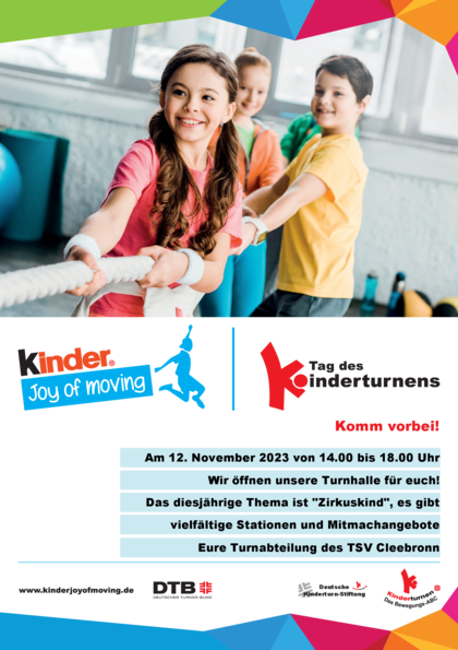 Seit 2017 feiern die Deutsche Turnerjugend (DTJ) und der Deutsche Turner-Bund (DTB) am zweiten Novemberwochenende den Tag des Kinderturnens. Jedes Jahr beteiligen sich deutschlandweit hunderte Vereine an der Aktion und öffnen ihre Türen, um Kindern einen bewegt-bewegenden Tag zu bescheren. Seit 2021 ist die Initiative kinder Joy of Moving als Partner des DTB dabei. Auch der TSV Cleebronn 1903 e.V. unterstützt die Aktion: