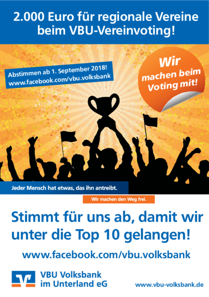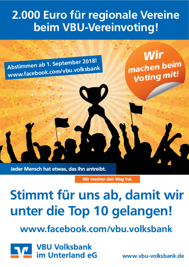 Die Teilnahme am VBU-Vereinsvoting ist ganz einfach: Jeder „Fan“ gelangt über die Anwendung „VBU-Vereinsvoting“ auf der Facebookseite der VBU Volksbank im Unterland eG in den Abstimmungsbereich. Hier werden alle teilnehmenden Vereine vorgestellt und jeder Facebook-Nutzer kann seine Stimme für einen Verein abgeben. Der Aktionszeitraum geht noch bis zum 15. Oktober.